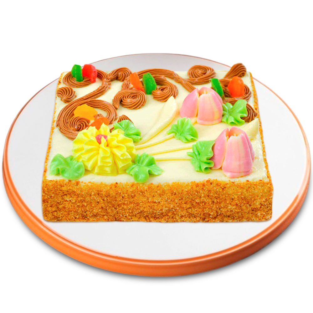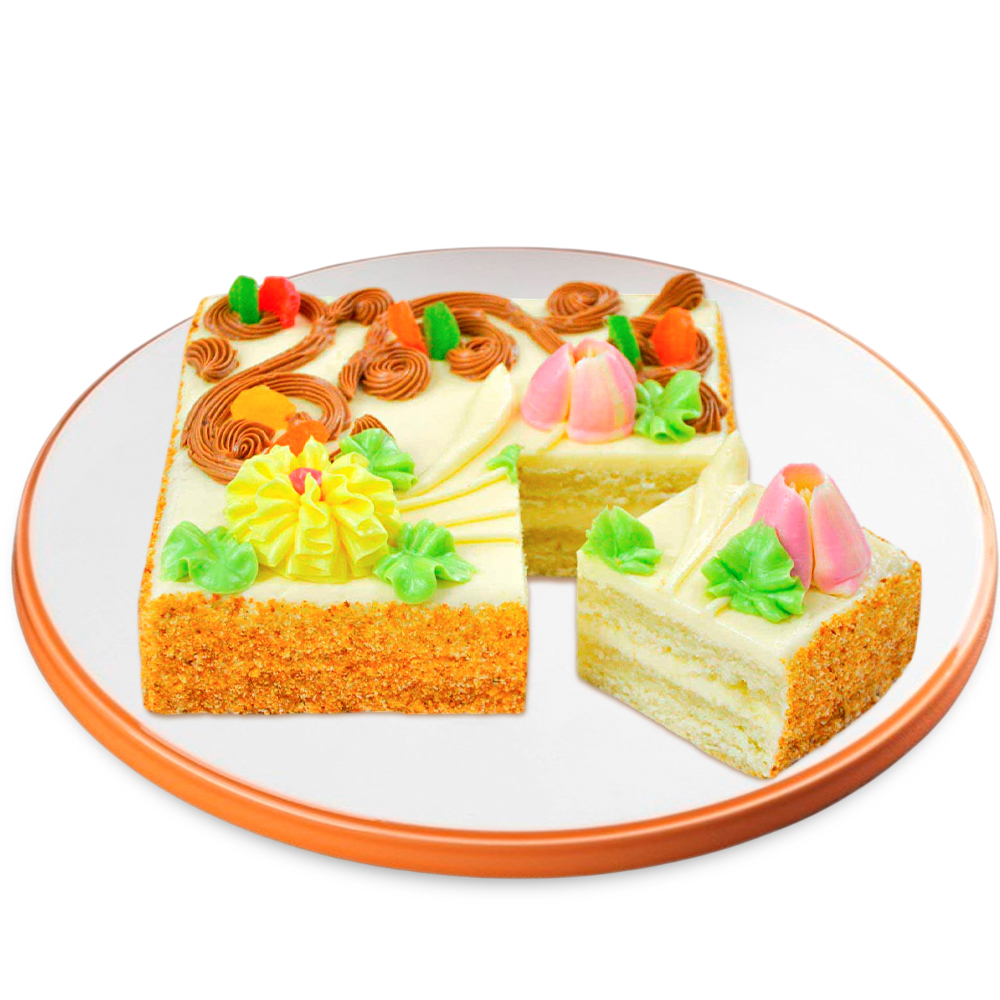 Классический торт из детства! Нежный бисквит пропитан сахарным сиропом и сливочным кремом.Украшен цветами и узорами из сливочного и шоколадного крема и цукатами.