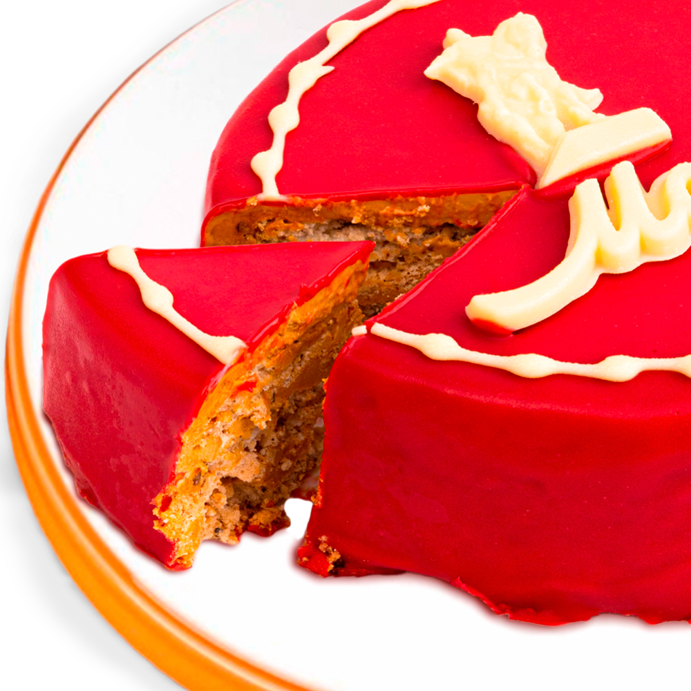 Настоящее лакомство из воздушного безе с фундуком прослоено кремом на основе вареной сгущенки. Поверхность торта декорирована красной блестящей глазурью на основе белого шоколада.